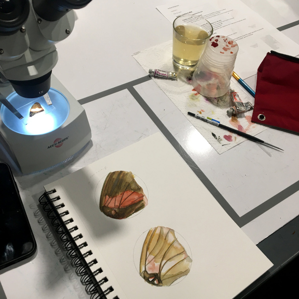 En 2022, j'ai eu vraiment la chance de collaborer avec les Amis de l'insectarium de Montréal en offrant deux séries d'ateliers de peinture naturaliste dans leurs salles de découvert. Nous avons regardé les fondaments de dessin et de peinture en aquarelle, et nous avons eu comme inspiration les insectes sous microscope, les insectes en plein diversité dans le Dome des spécimens, et les insectes en action dans le vivarium. Après chaque séance d'observation et de peinture avec les participantEs passionnéEs de la nature, je me sentais remplis de couleur et de beauté dans l'esprit. Merci à l'insectarium, Les Amis de l'insectarium et toutes les participantEs.